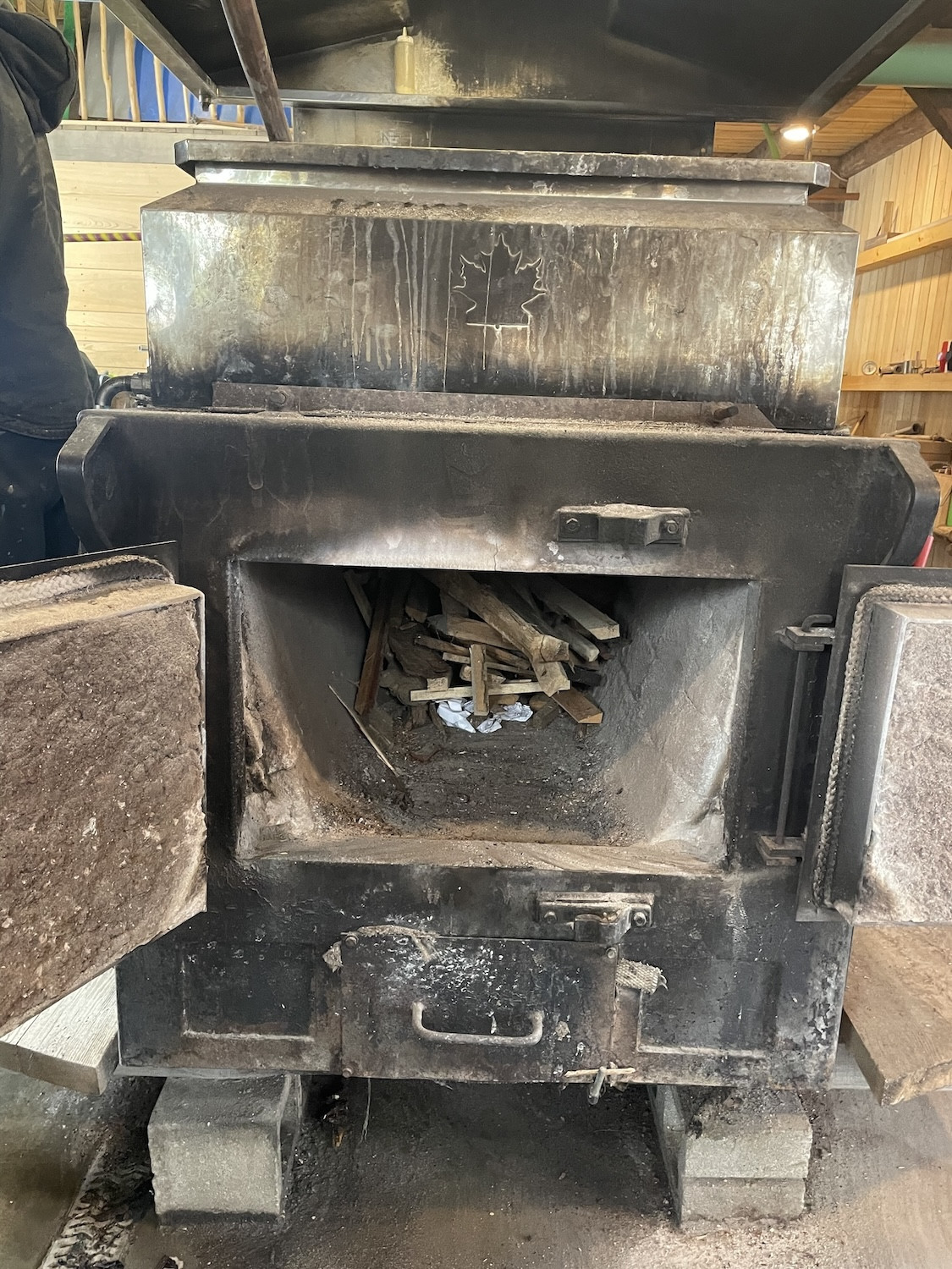After that, it goes into another big stainless steel pot in the sugar shack (yup, that's what an old fashioned place that makes maple syrup is called). And then, the heat is turned on. Our maple syrup is cooked over a wood stove!